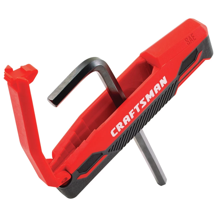 Useful on many DIY projects, including fixing furniture, bicycles, electronics, cars and motorcycles, Craftsman hex key kit contains precise SAE sizes for the vast majority of applications. These L-Keys come with an adapter that easily converts them to a T-handle for additional torque. High-durability strong steel hex keys with black oxide coating add adherence when working on fasteners. A convenient storage rack for hex keys and handle keeps this set together in your toolbox. The kit includes the following SAE hex keys: 1/16-in, 5/64-in, 3/32-in, 1/8-in, 5/32-in, 3/16-in, 7/32-in, 1/4-in, 5/16-in and 3/8-in. This product comes with Craftsman/s full lifetime warranty.