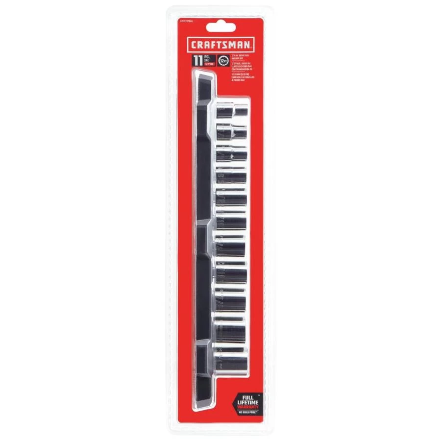 This Craftsman socket set features a polished chrome finish for superior corrosion resistance and enlarged markings to make it easy to identify the sockets you’re looking for. In addition, their 12-sided design allows for faster coupling, ideal for light-duty work. Craftsman sockets meet or exceed ASME standards. This set includes 11 regular sockets in 3/8 in, 7/16 in, 1/2 in, 9/16 in, 5/8 in, 11/16 in, 3/4 in, 13/16 in, 7/8 in, 15/16 in and 1 in sizes. This set is covered by the Craftsman lifetime warranty.