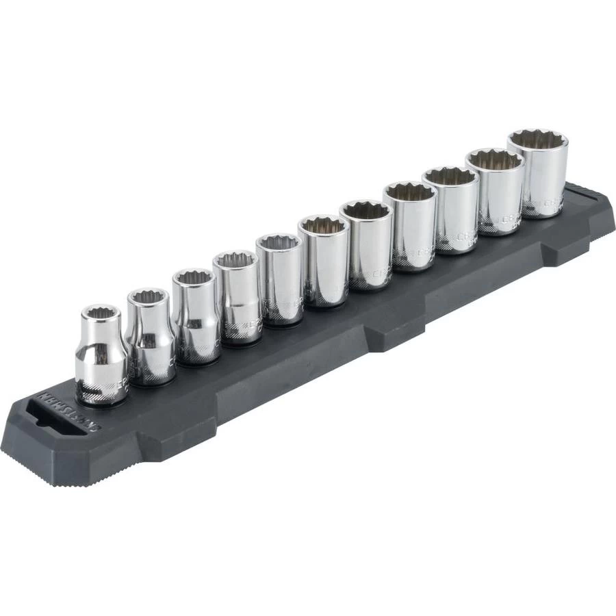 - Includes eleven 1/2-in Dr shallow 12 PT sockets SAE – 3/8-in, 7/16-in, 1/2-in, 9/16-in, 5/8-in, 11/16-in, 3/4-in, 13/16-in, 7/8-in, 15/16-in, 1 In