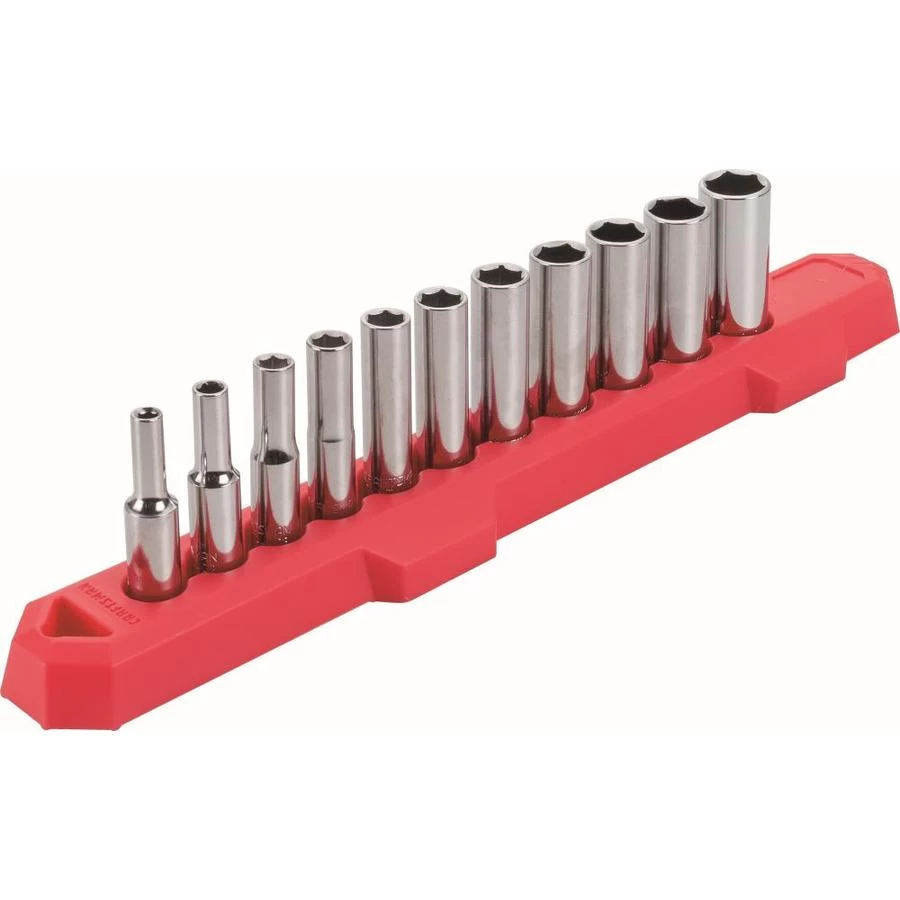 This socket set by Craftsman® features a polished full chrome finish for corrosion resistance and large markings to help you quickly identify the sockets you are looking for. Also, the 6-point socket design allows for increased torque due to a larger contact surface. Sockets meet or exceed ASME specifications. This set includes 11 deep sockets from 4 mm to 14 mm. This product is backed by the Craftsman® full lifetime warranty.