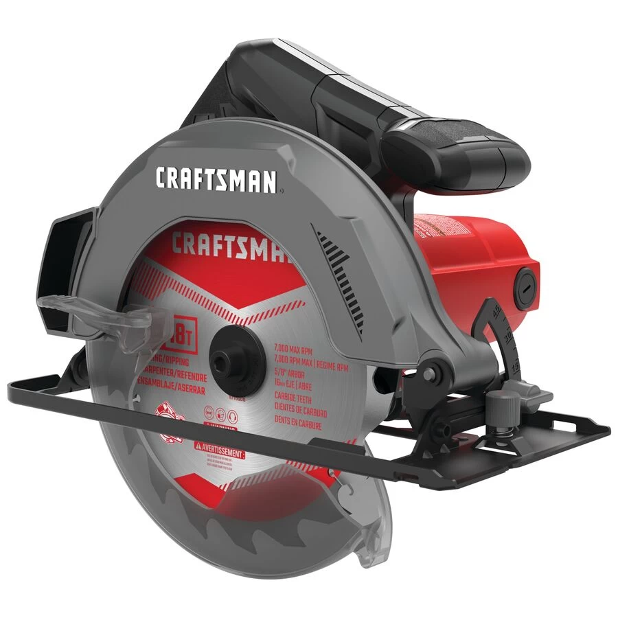 This Craftsman(R) circular saw will allow you to accomplish all your renovation projetcs. Designed for a blade measuring 7 1/4″ in diameter, it offers a consistent power of 13 A and will never lose velocity due to a discharged battery. Equipped with a high performance motor of 5300 RPM, this saw is perfect for fast, aggressive cuts in rough material, such as framing. Its lightweight, bevelling shoe allows for angled cuts of up to 45 degrees. The ideal tool for cross-cutting and ripping through soft and hardwood, this circular saw is sold with a 7 1/4″ carbide tipped stainless steel blade of 18 teeth and one hexagonal wrench. This product is backed by a 1-year limited warranty against any defects in material or workmanship.