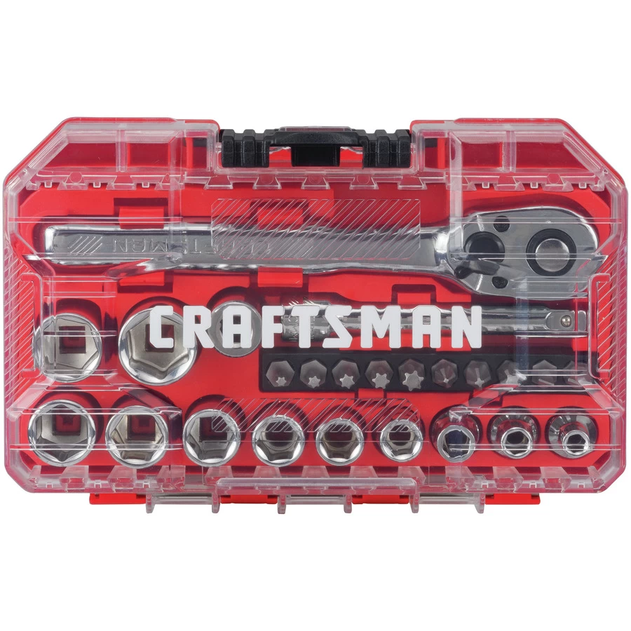 Craftsman(R) 24-piece 1/4-in Drive 6 Point metric mechanics toolset comes equipped with a 72-tooth ratchet, a broad assortment of drive tools, and a compact storage case. This set is perfect for automotive repair, general construction, and DIY repairs. Compatible with the Versastack(TM) portable storage system, this set includes sockets, a drive bit adapter, a drive pear head ratchet, 11 specialty bits and more, all in a full polish chrome finish for corrosion resistance. Large markings ensure quick size identification.