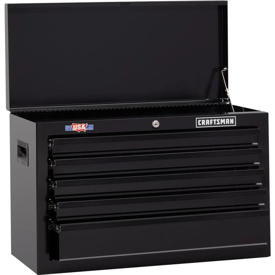 This Craftsman(R) tool chest offers an ideal storage solution for tools and supplies with its innovative design and great price. With a width of 26″, it features five drawers and a hinged cover to offer spaces of different sizes to store hand tools, power tools, parts and everything in between. Made of black-coloured steel, this tool chest can support a total of 50 lb per drawer, offering a total storage capacity of 3589 cu. in. It has a ball-bearing drawer slide system, recessed side handles and an external keyed locking system. You get quick and easy access to the tools that you use most frequently, and with a simple turn of a key, you will not have to worry about your gear. Backed by a 3-year limited warranty, this product can be combined with the CMST22741BK (41536891) rolling chest, sold separately, in order to create a nine-drawer tool center with lid, therefore offering an excellent storage solution.