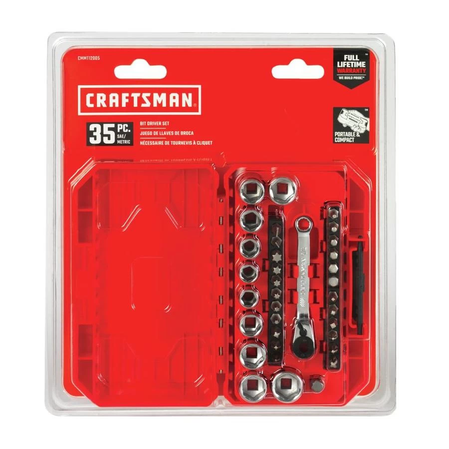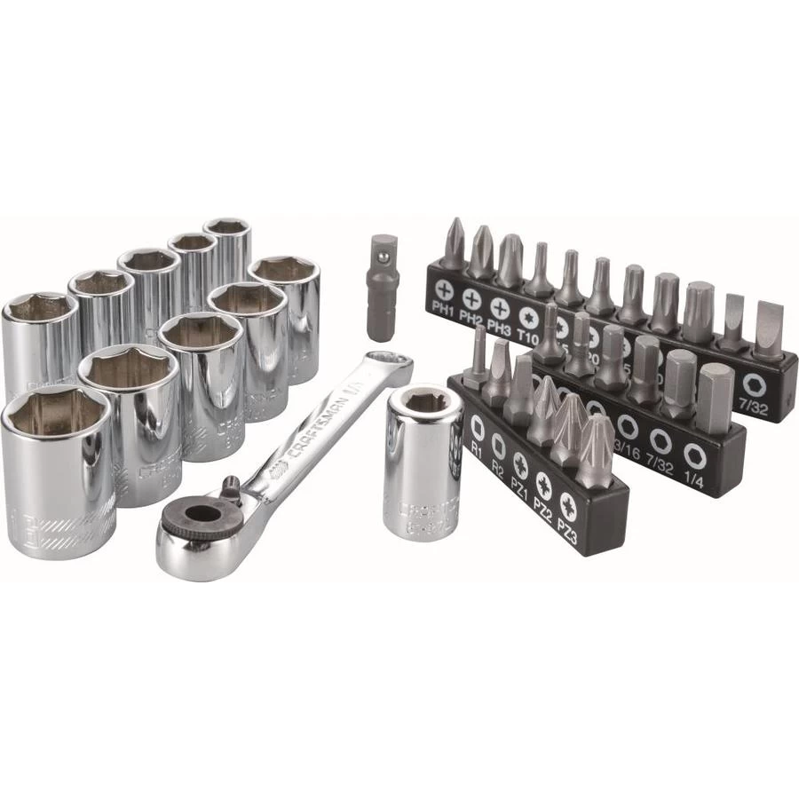 Enjoy a premium, mechanic-style set for routine applications such as automotive and domestic mechanical repair. This mechanical kit is equipped with 35 right-angle bits and sockets as well as a ratchet screwdriver for better access to your fasteners. Sockets are covered with a fully polished chrome finish for superior corrosion resistance. The key handle has a 15° offset for clearance in tight spaces. In addition, a compact storage case makes it easy to transport tools and gives them an exceptional durability. This set comes with Craftsman’s full lifetime warranty.