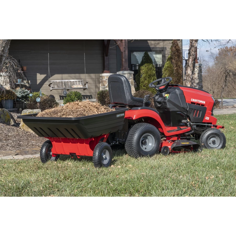A handy tractor accessory, this Craftsman trailer quickly moves straw, rock, gravel, or other construction material. Its dump cart design ensures that you can drop the contents of the trailer instantly and effortlessly.