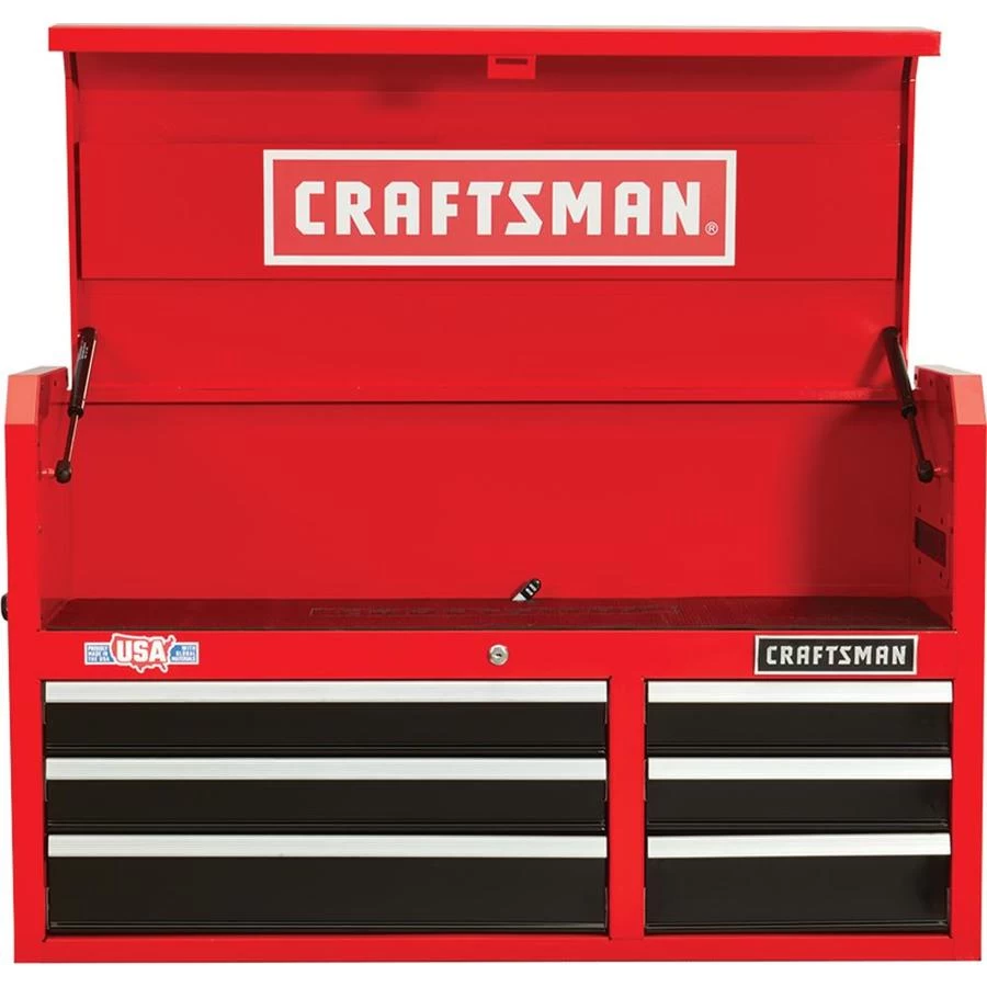 This Craftsman(R) tool chest offers all the storage you need for your tools of all sizes. Made of durable steel with red and black coating, it features six drawers with smooth-closing ball bearing slides. It has three small drawers and three larger ones, therefore adding versatility to this storage unit. The top part of the chest has a rubber mat and allows you to store your power tools or bigger accessories, and its cover is equipped with a closing system operated by premium quality gas struts. You even have six electric outlets and two USBÂ ports, making this top part a battery-charging area for your tools. With its width of 40.5″, its height of 24.5″, and its depth of 16″, this tool-chest is the perfect addition for your garage or workshop. Backed by a 10-year limited warranty.