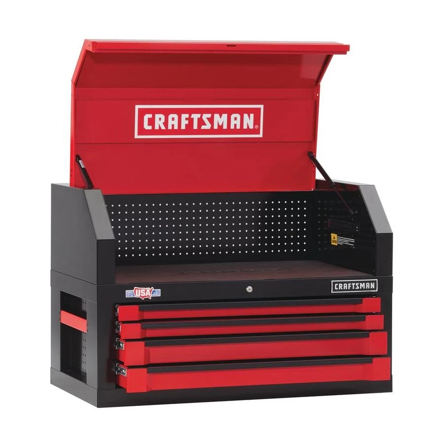 The 3000 Series Craftsman® 41″ 4-drawer tool chest combines solid construction with some of the hottest trends in tool storage. This chest is 22″ deep and is made with quality materials that strengthen the design. The soft-close drawers gently pull themselves closed and will not slam shut. This helps keep your tools in place and ensures your drawers stay closed. Each heavy-duty drawer can support 120 lbs. and glides smoothly on ball-bearing slides. A deep open till storage area under the lid includes six outlet and two USB ports, making it the ideal place to store and charge your power tools and electronics. 18-gauge extra deep I-Frame® construction holds up to heavy use. The pegboard areas of chest lid and in I-Frame® sides help organize your tools. Gas struts support the tool chest lid and provide access to the charging area. Keyed internal locking system safeguards your tools. Recessed full-grip side handles help move storage around your shop. 13,194 cu.in of storage. 10-year limited warranty.