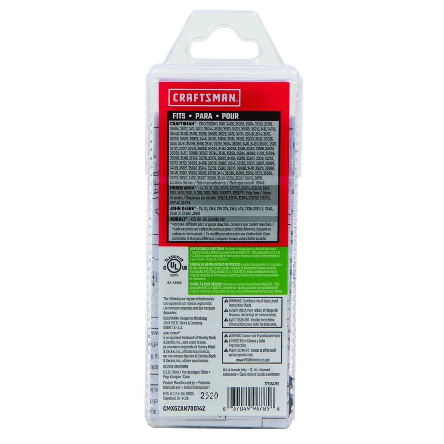 This 8-in low kickback Craftsman replacement fits Craftsman, Echo, Husqvarna. Meant for cordless chainsaw, its has a pitch of 0,375-in.