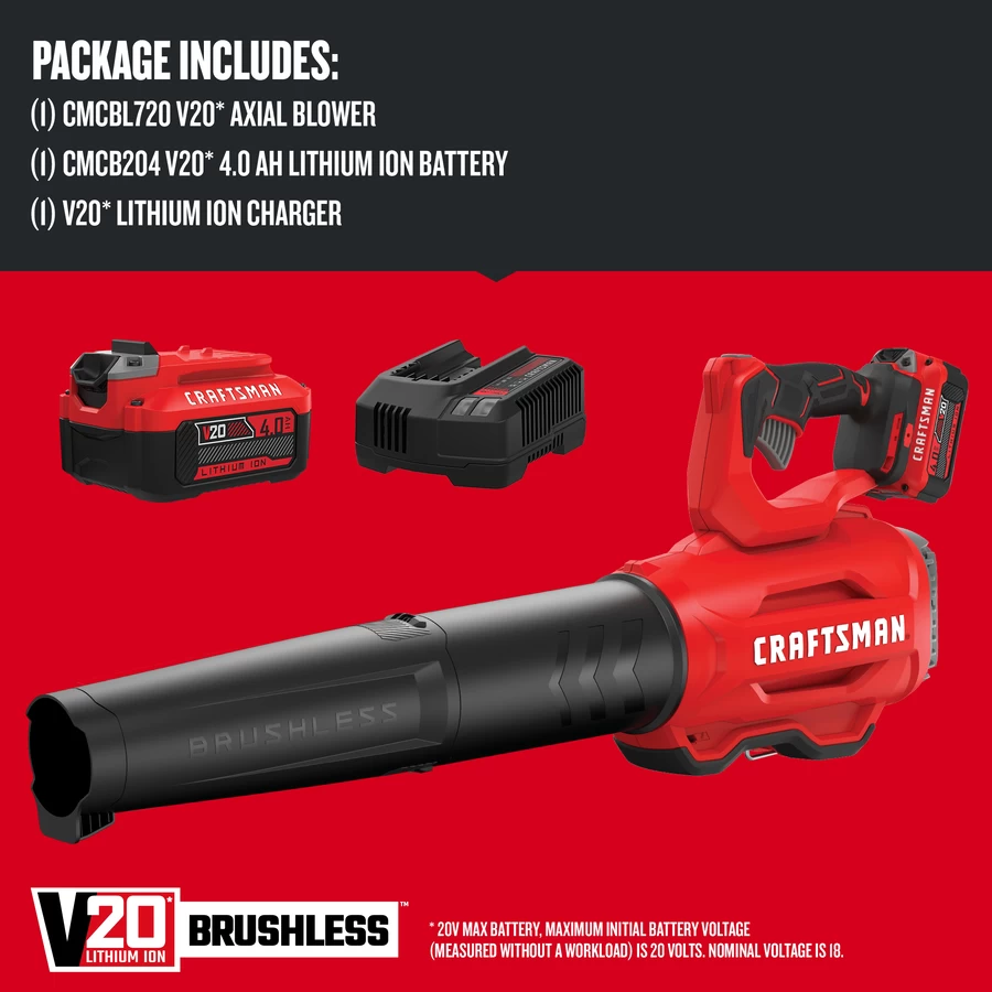 - Includes CMCBL720 axial blower, CMCB402 V20 20-volt MAX 4.0 AH lithium ion battery, V20 20-volt MAX lithium ion charger and an instruction manual