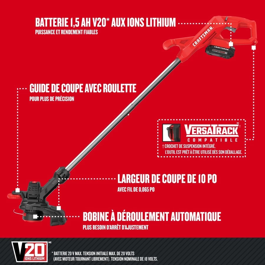 Craftsman(R) V20 Cordless Weedwacker(R) string trimmer/edger kit comes with a 10-in width, 0.065-in diameter cutting swath with automatic line feed system so you can fully take care of the trimming task instead of bumping the feed spool. A reliable motor is powered by a 1.5 Ah lithium-ion battery to efficiently work through thick lawns. Get precise control over edging jobs with the built-in wheeled edge guide. When not in use, conveniently store your trimmer using the integrated VersaTrack(TM) hook with the VersaTrack(TM) wall organization system (sold separately). The V20 battery platform is compatible with more than a hundred Crafstman(R) V20 outdoor equipment and power tools.
