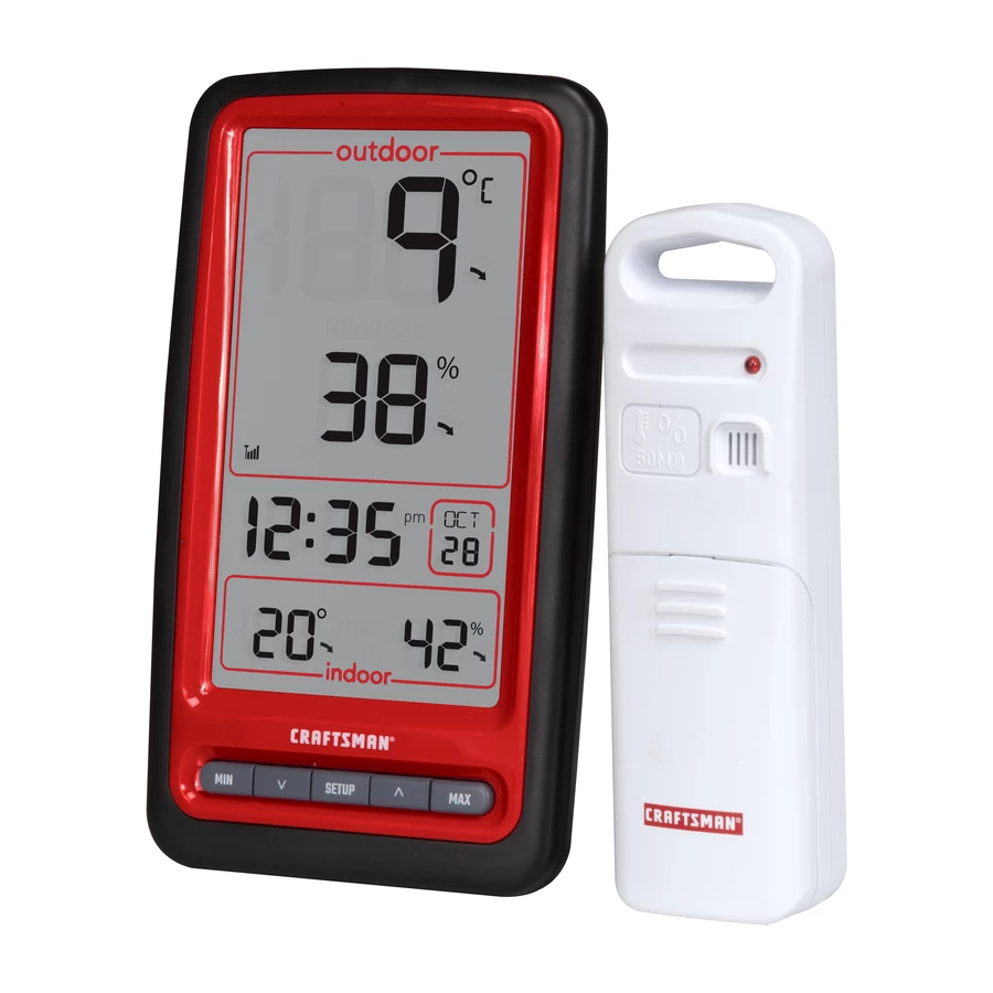 This thermometer by Craftsman displays temperature and humidity measurements as well as the time and date. It also displays the indoor temperature and humidity of the room the display is in. 1-year warranty.