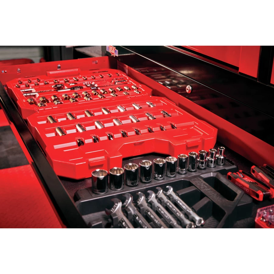 - Includes (7) 1/4-in MM 6 PT (4,5,6,7,8,9,10mm), (8) 1/4-in SAE 6 PT (5/32,3/16,7/32,1/4,5/16,3/8,7/16,1/2-in), (12) 3/8-in MM 6 PT (10,11,12,13,14,15,16,17,18,19,21,22mm), (8) 3/8-in SAE 6 PT (3/8,7/16,1/2,9/16,5/8,11/16,3/4,13/16-in), 1/4-in bit driver