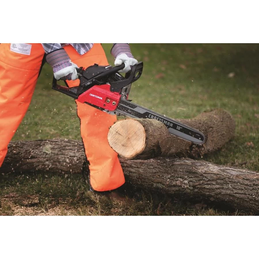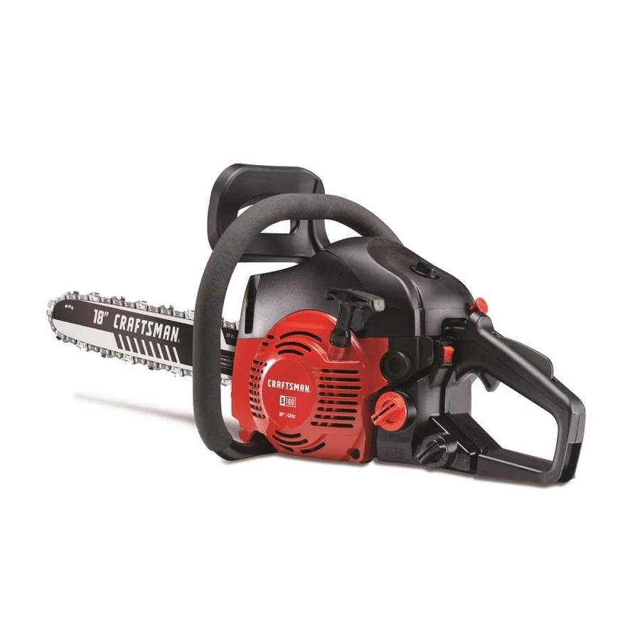 The CRAFTSMAN S180 gas powered chainsaw features a 42cc full-crank high output engine to deliver steady power. The 18-in low-kickback bar and chain goes through even the toughest wood quickly and easily. It is equipped with Easy Start technology for simpler pull starts to get the job done fast. The durable pro-grade chassis is engineered to withstand the most brutal and prolonged cutting tasks. The cushioned wrap aluminum handle and 3-point anti-vibration system makes this chainsaw balanced, maneuverable, and comfortable to operate. Features such as the automatic oiler, inertia-activated chain brake, and tool-free access to filter and spark plug enhance the design of the chainsaw to make cutting a breeze. Comes with a heavy-duty carrying case, an extra chain, and 2-cycle oil.