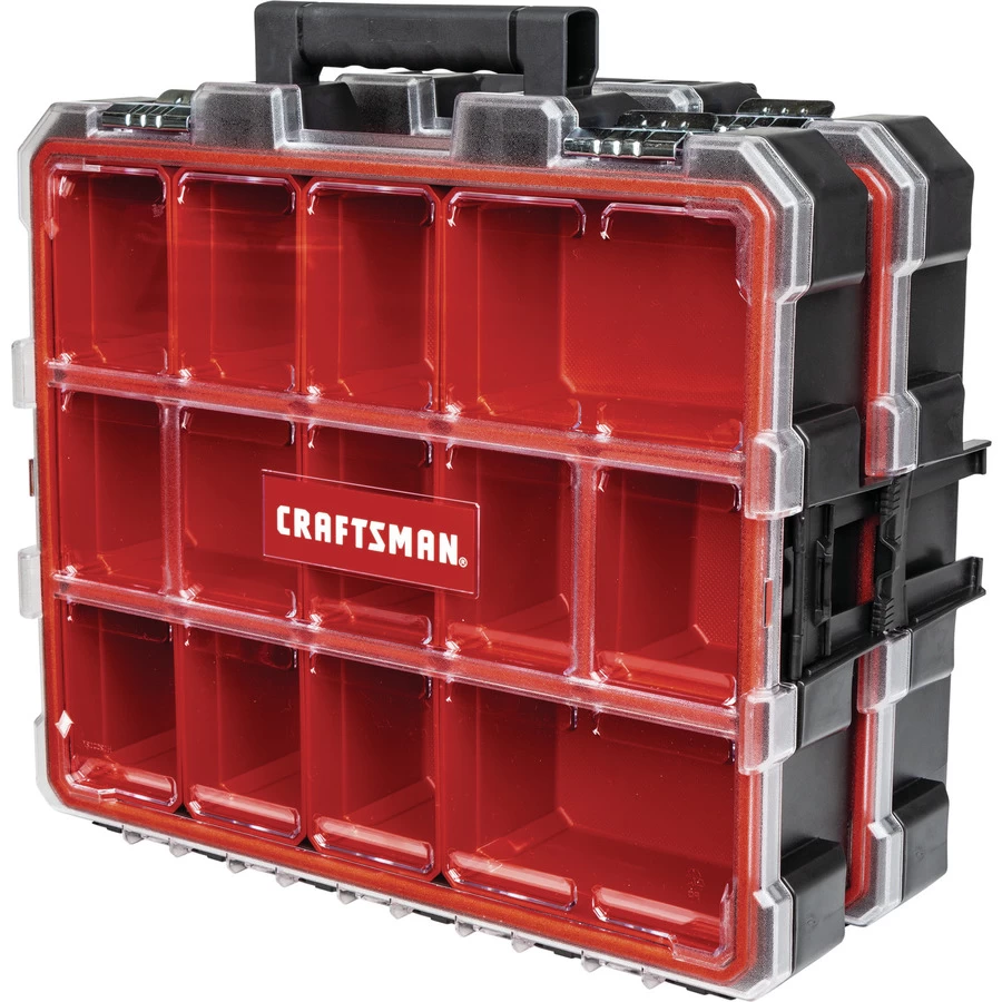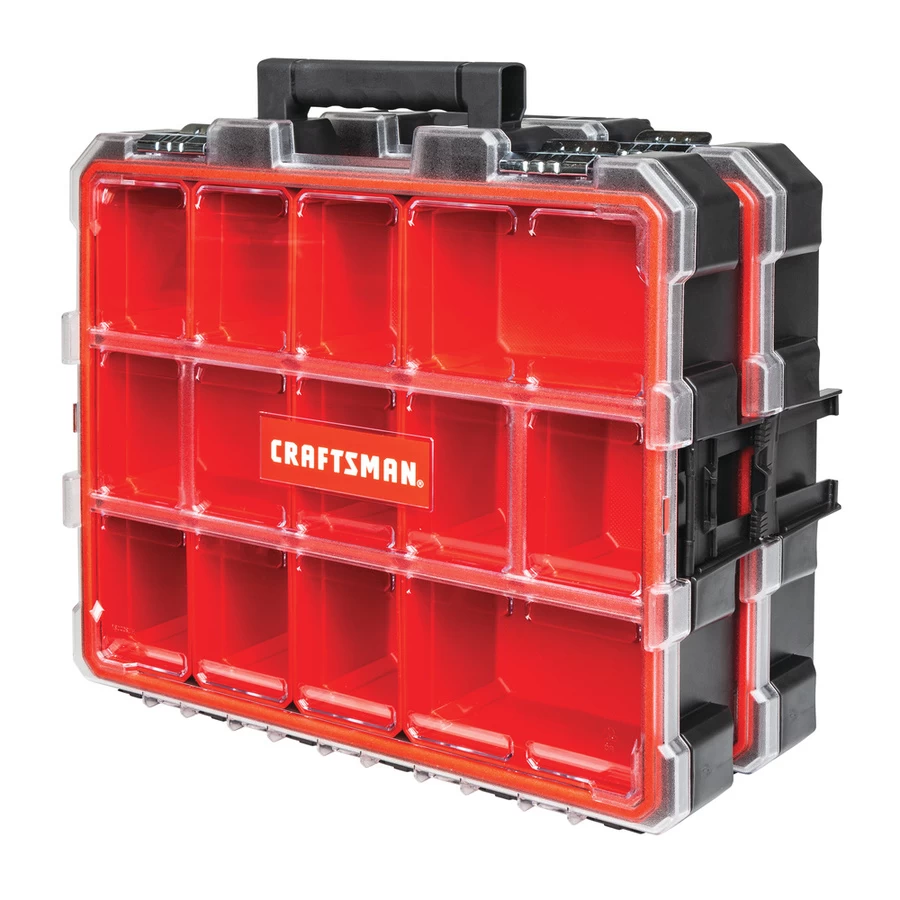 This Craftsman® XL Pro tool organizer includes 3 large cups and 9 medium cups to store small tools and parts. Its clear, impact-resistant heavy-duty lid locks all compartments in place. The organizer features a IP53 rating for dust and water resistance along with sturdy body and lid make this organizer durable and suitable for any job and the ergonomic handle provides for easy carrying. It is part of the Versastack(TM) system, which allows organizers to stack one on top of the other and locking them using the side latches for maximum convenience.
